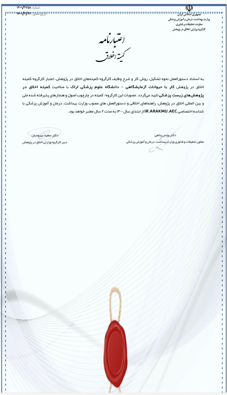 اخذ اعتبار نامه کمیته اخلاق در پژوهش کار با حیوانات آزمایشگاهی برای دانشگاه علوم پزشکی اراک ۰۱ تیر ۱۴۰۱ | ۰۷:۲۲ کد : ۲۷۲۴۶ اطلاعیه ارسال به دیگران نام شما ایمیل شما ایمیل دریافتکننده ارسال انصراف تعداد بازدید:۱۷۵۶۴